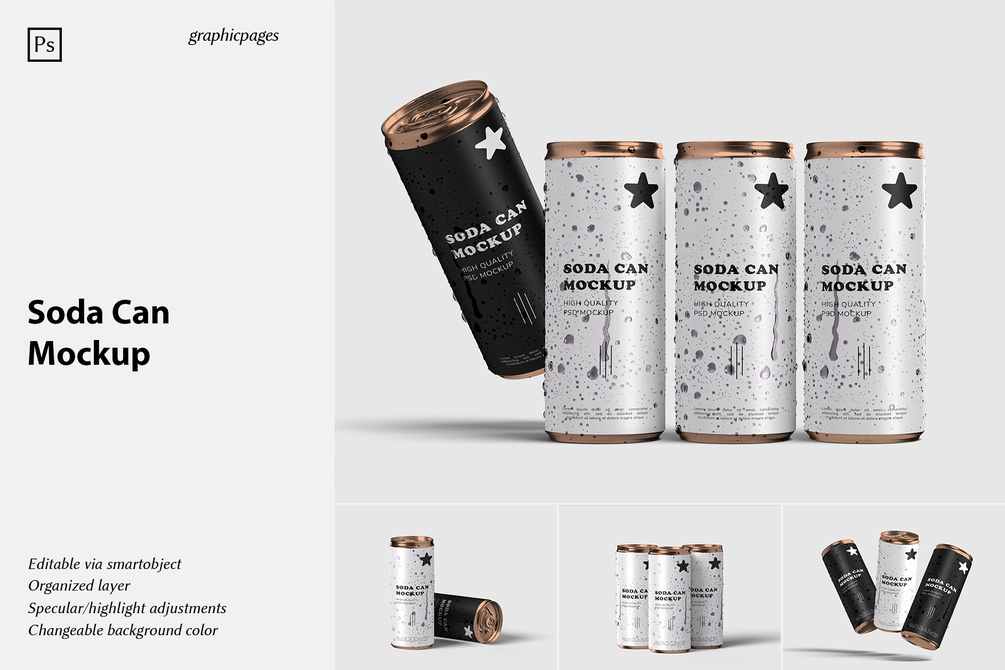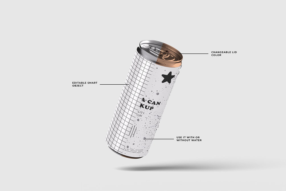 Hello! This is soda can mockup is a mockup scene creator. All objects and shadows are fully separated, so you can easily play with them and create your own scenes. to change the design just replace the design into the smart object layer, hit save, and you are done.